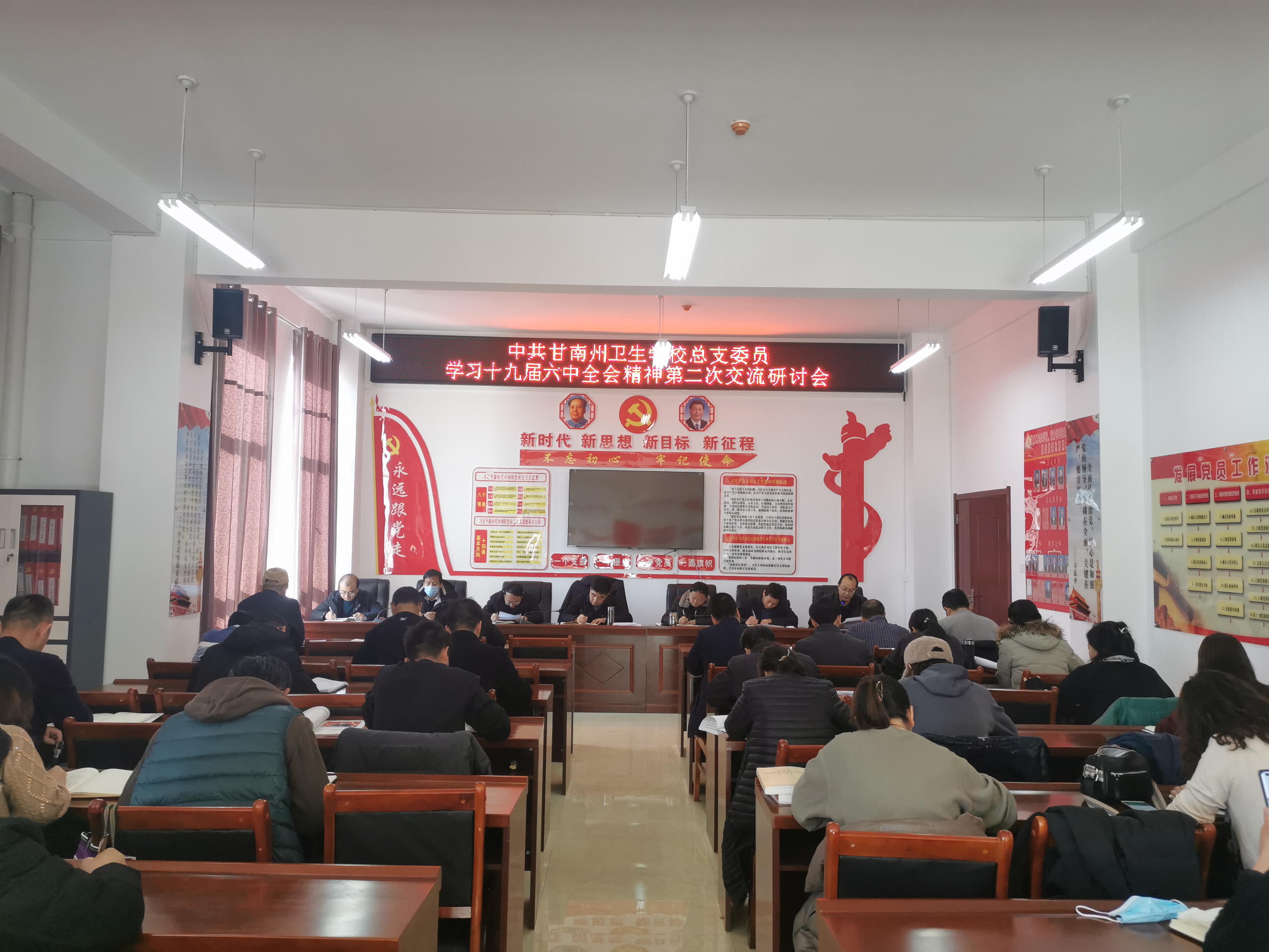 教学支部陈玉德、大卓玛草、冯培祥、章蓉蓉、王宇,员工支部鲁光颖,行政支部孙居礼、王倩男、索南卓玛9名同志,结合学习十九届六中全会精神及教学工作展开了交流研讨。