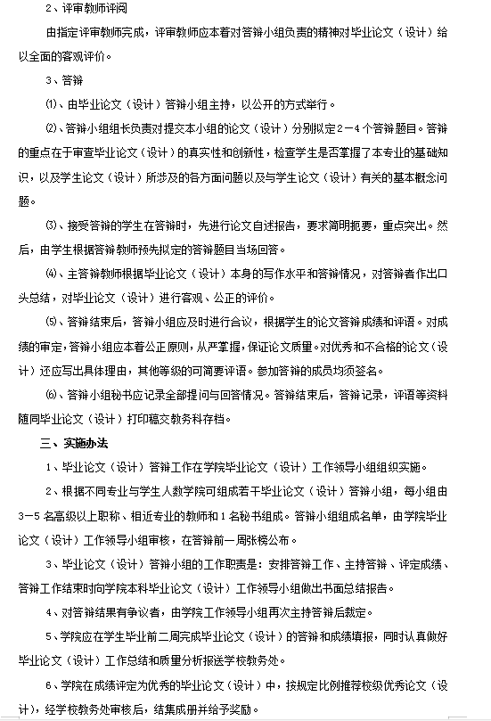 1. 论文题目确定后,员工在教师指导下拟定提纲,撰写论文初稿,并根据指导教师的意见进行修改。论文定稿后由指导教师仔细审阅,认真写出评语,作出恰当评价,提出优点和不足,并初步评定成绩。