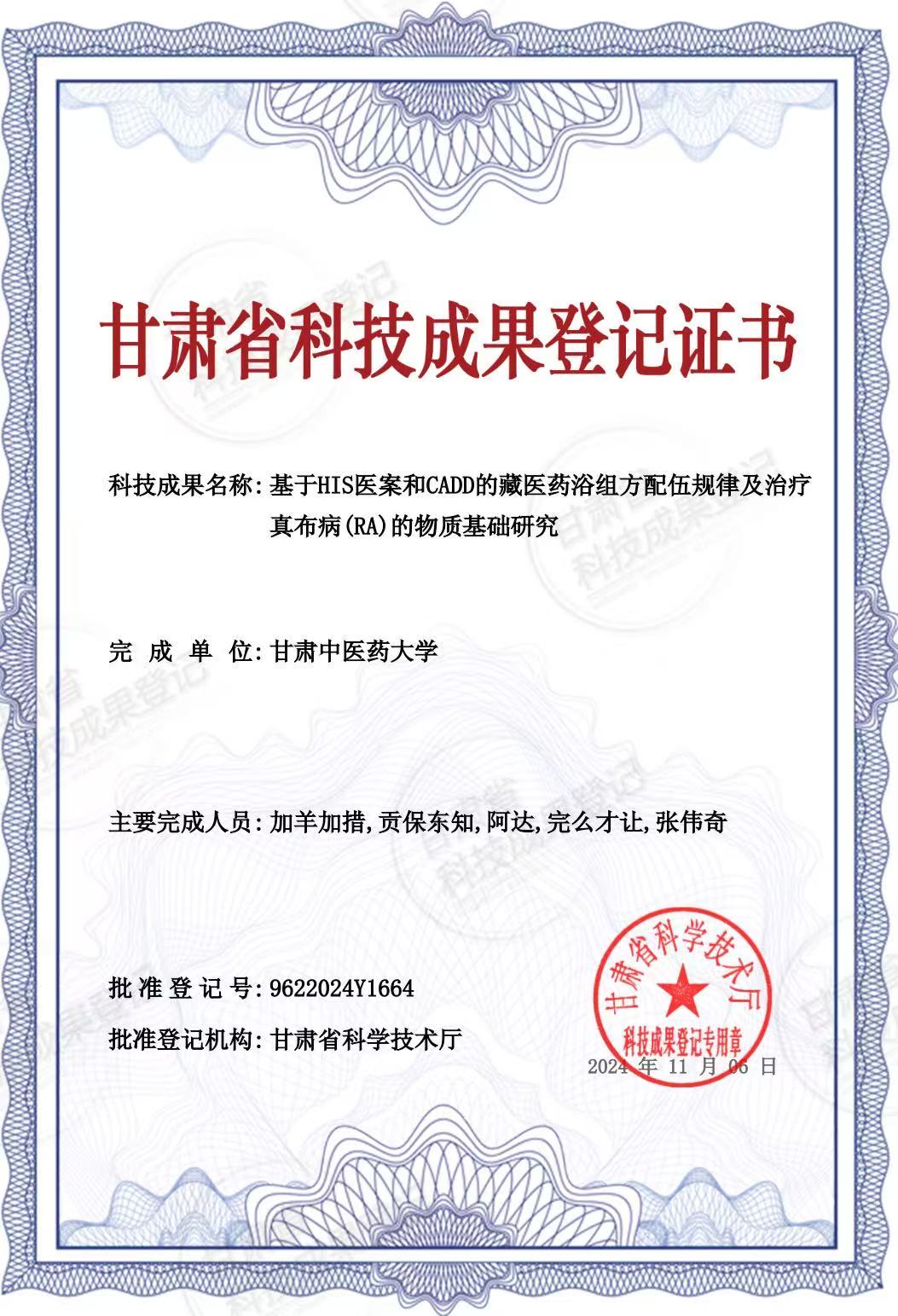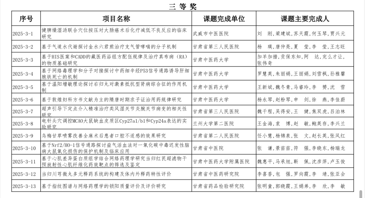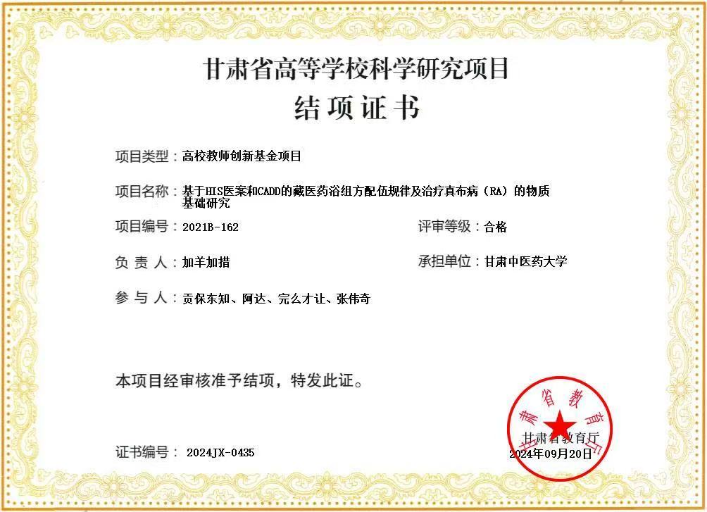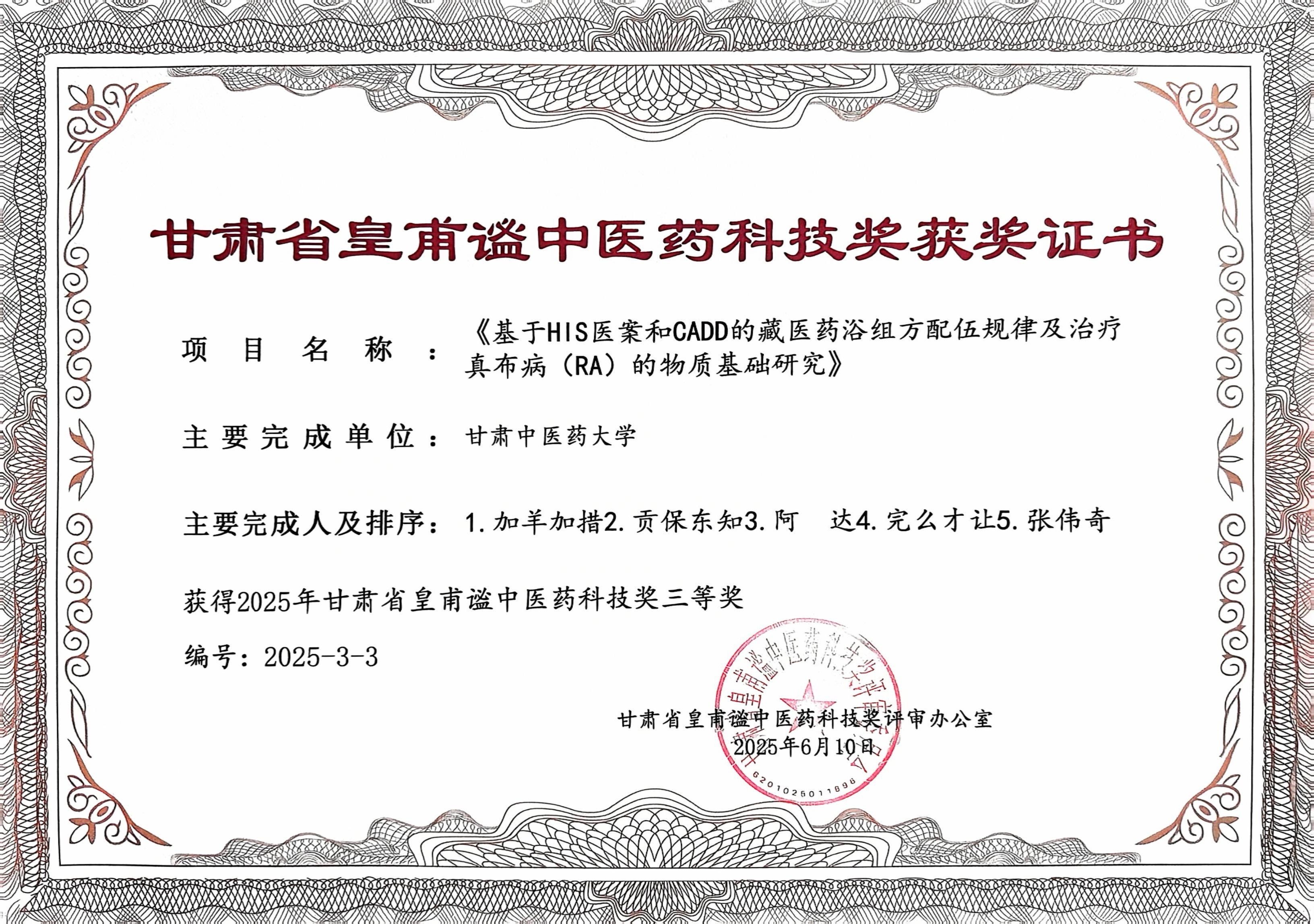 近日,2025年度甘肃省皇甫谧中医药科技奖获奖成果正式公布。该奖项由甘肃省科技厅批准、甘肃省中医药学会组织实施,作为甘肃省中医药行业极具权威性的科学技术奖项,评选标准严格、竞争激烈。公司加羊加措教授团队申报的《基于HIS医案和CADD的藏医药浴组方配伍规律及治疗真布病(RA)的物质基础研究》项目凭借卓越科研成果,脱颖而出,荣获甘肃省皇甫谧中医科技进步三等奖。此次获奖,不仅是对公司加羊加措教师团队科研实力的高度认可,也充分彰显了公司在藏医药科研领域的深厚积淀与突出贡献。