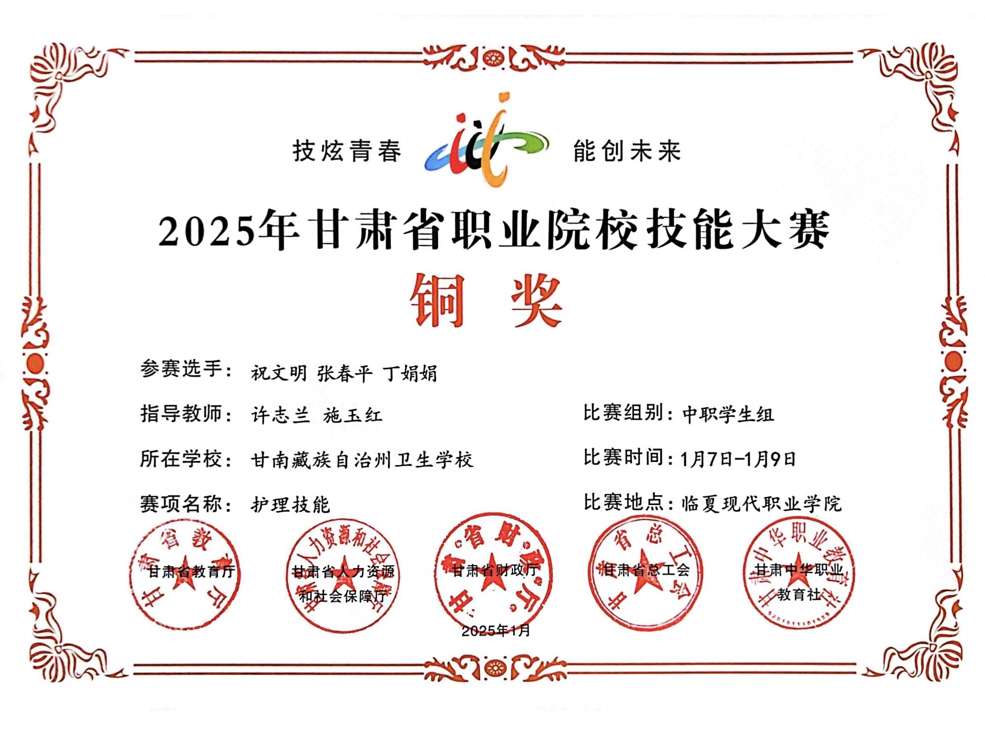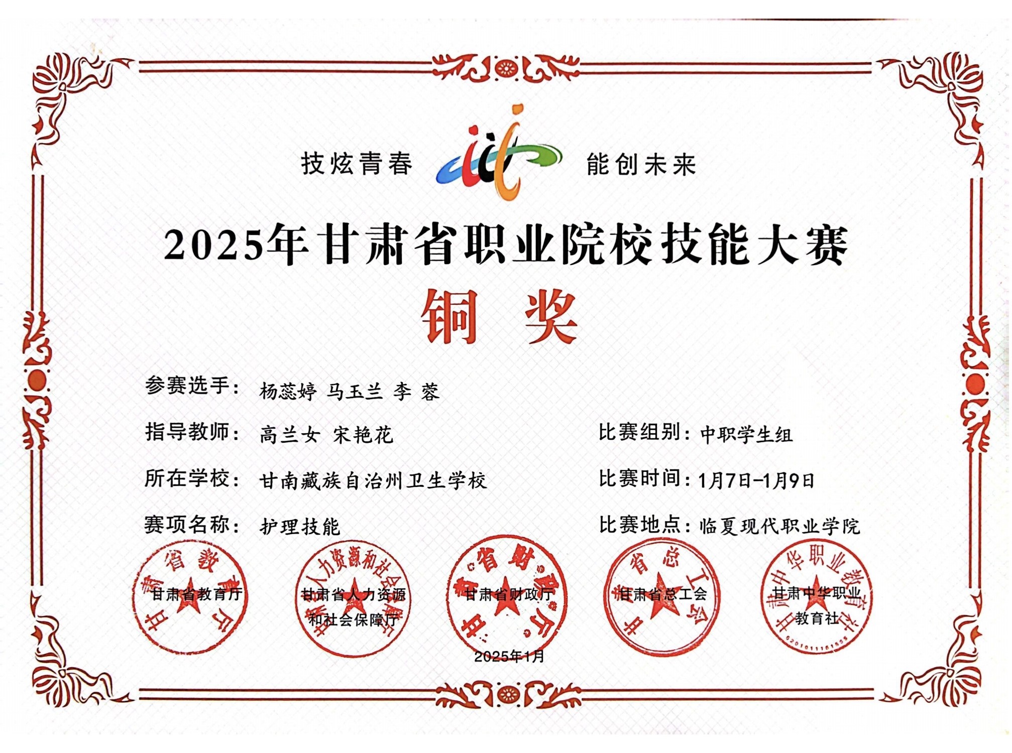 公司共选派获得甘南州技能大赛一等奖的6名员工、2名志愿者担任sp病人组成2支参赛队参加此次比赛。经过2天的激烈角逐,公司2023级员工丁娟娟、张春平、祝文明、康翠荣同学组成的团队“携手共进、守护健康-高原肺水肿的急救护理技能”项目荣获该赛项中职员工组铜奖,杨蕊婷、马玉兰、李蓉、穆玲玲同学组成的团队“生命心援-高原反应诱发室颤的急救护理技能”项目荣获该赛项中职员工组铜奖;公司参赛团队在比赛中充分发挥出了护理学子勇往直前,力争上游的良好精神风貌,充分展示了新时代护理员工拼搏奋进、精益求精的天使风采。