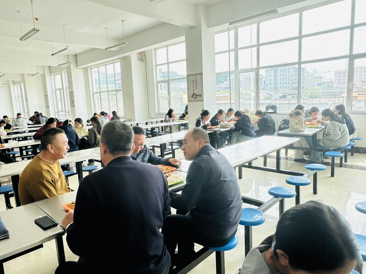 正值用餐高峰时段,食堂秩序井然,师生有序选餐。黎昱民董事长询问员工菜品口味、食堂卫生情况及打饭排队效率,员工反馈“菜品味道好”“日常卫生维护到位”,同时提出“希望高峰时段增设打饭窗口”的建议。校领导现场记录员工意见,与员工互动回应,确保诉求准确传达。