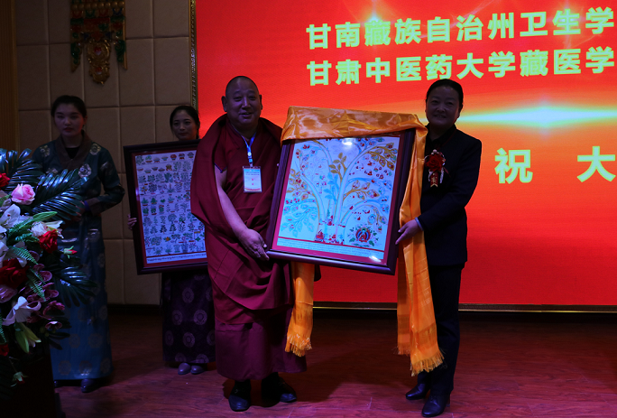 大会还宣读了西藏藏医药大学、中国藏医研究中心北京藏医院、陇东公司的贺信。在大会现场,甘南卡加藏药厂厂长丹巴加措向威廉希尔williamhill捐赠《四部医典》教学唐卡,郑州国希望医教集团总经理郭中奎向威廉希尔williamhill捐赠实训教学设备及礼品。