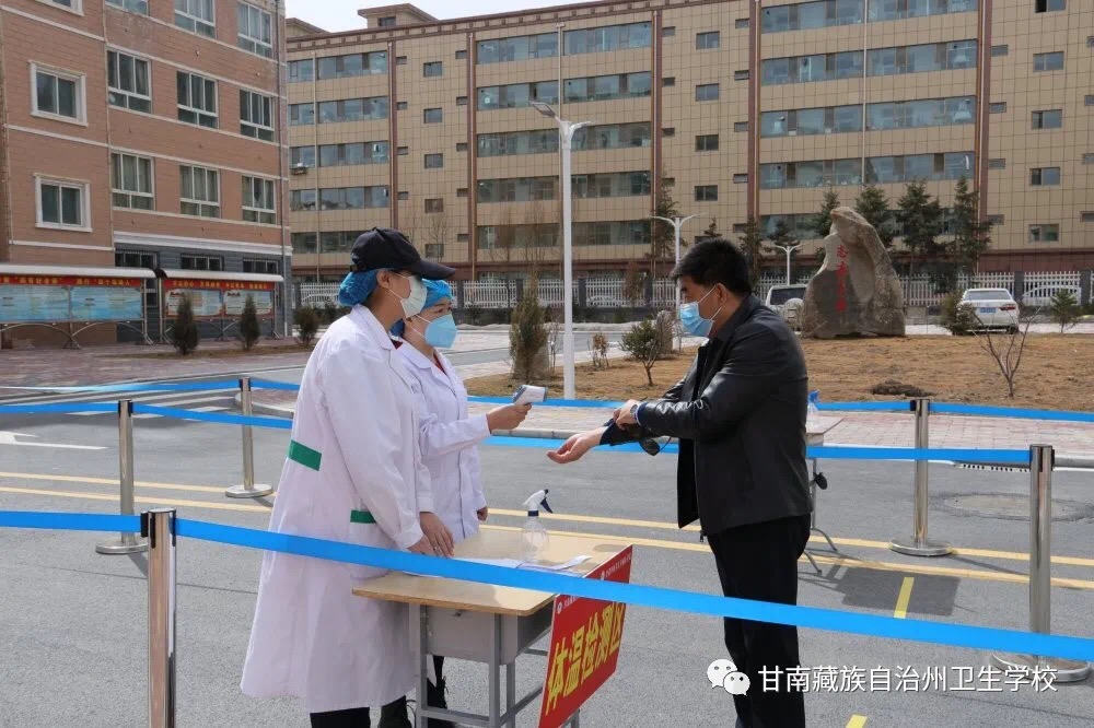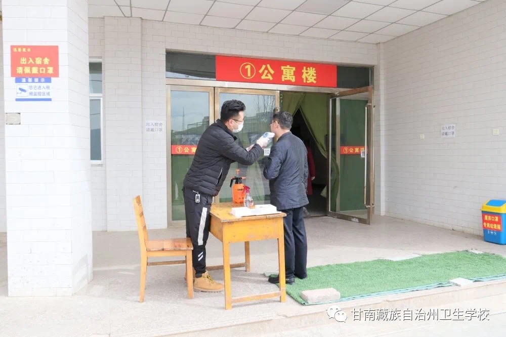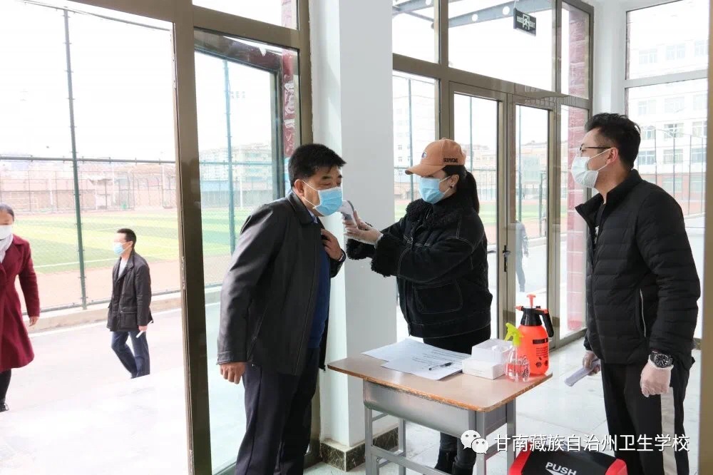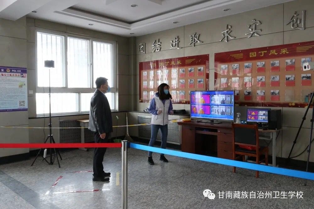 模拟员工通过红外线体温测量进入教学楼。
