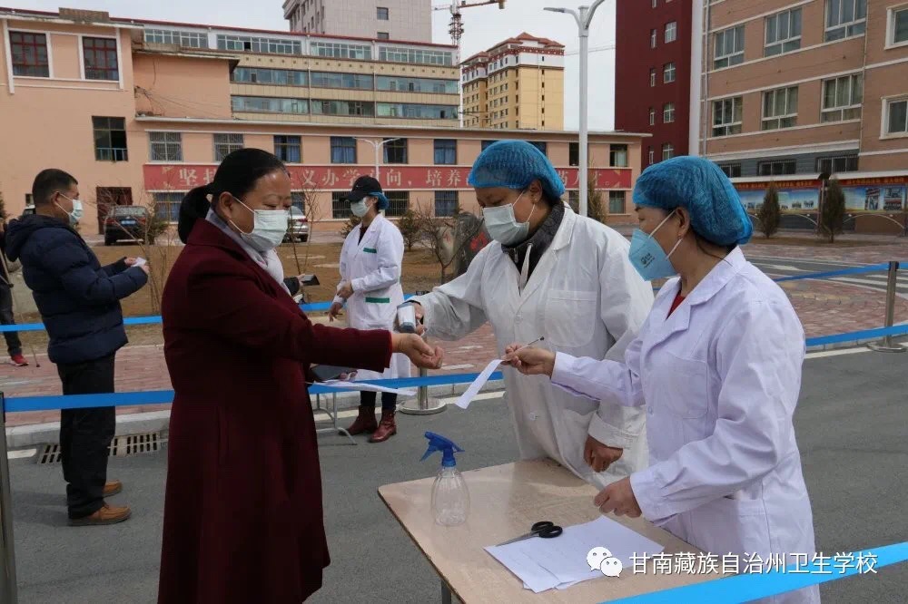 在健康码验证区卡点,模拟员工用手机提供健康码,无误后填写个人信息并持信息表,校医室人员开始体温测量,正常员工报到。