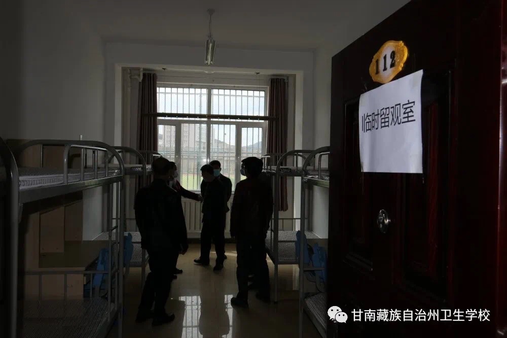 在体温检测卡点,模拟对出现发热、咳嗽等情况员工由校医室人员领到临时隔离区,报告上级单位联系定点医院(州医院)。