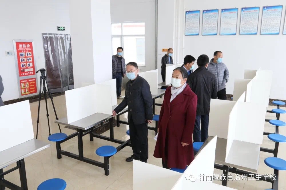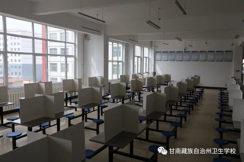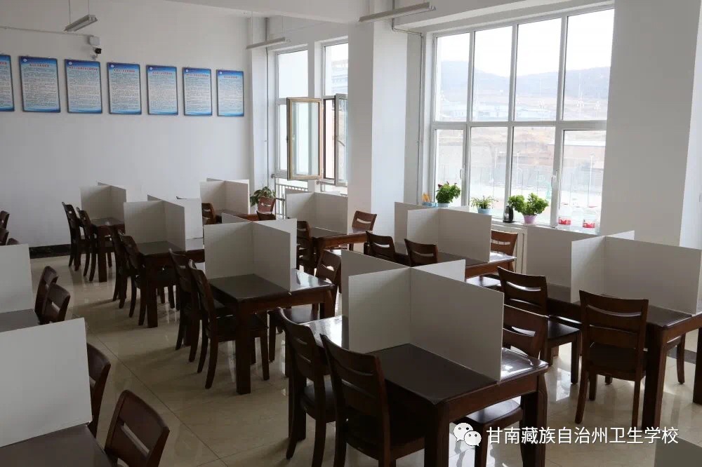 模拟师生食堂就餐。实行错峰用餐,排队领餐间隔一米,餐桌设置十字型隔断。