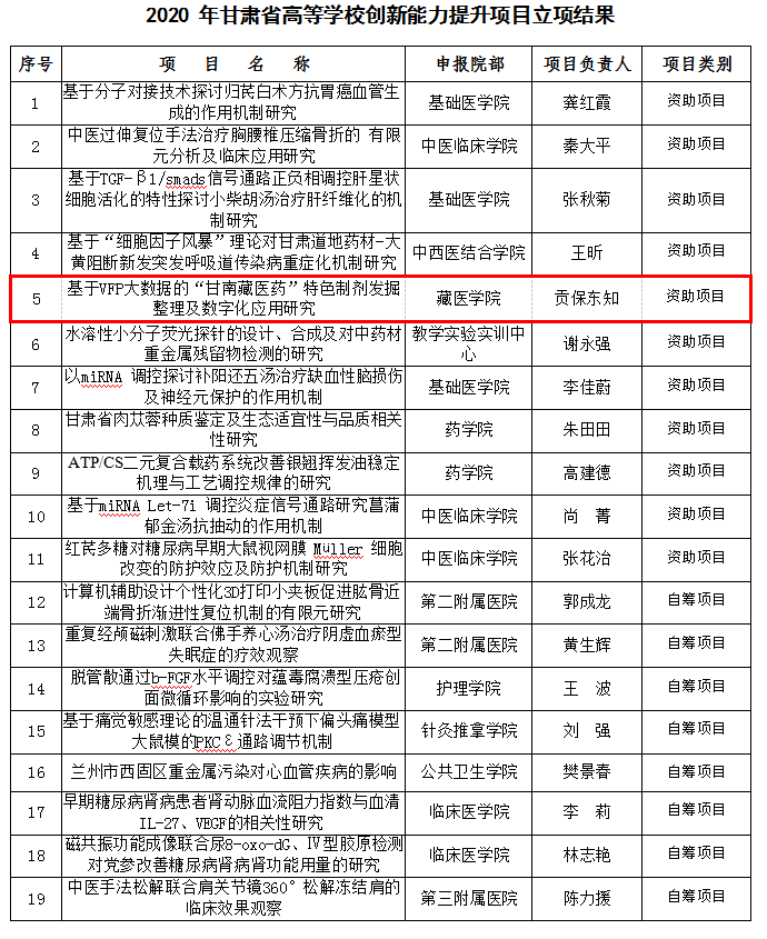 按照2020 年度甘肃省教育厅高等公司创新能力提升项目推荐工作要求,威廉希尔williamhill教师、藏医学博士加羊加措和贡保东知联合设立的《基于VFP大数据的“甘南藏医药”特色制剂发掘整理及数字化应用研究》项目,经威廉希尔专家组评审通过予以立项并公示。同时,根据甘中医大科发[2020]5号《关于下达2020年度威廉希尔新型冠状病毒感染的肺炎应急防治专项的通知》精神,两位博士联合设立并申报的《基于文献整理和生物信息学技术的藏医抗新冠肺炎组方挖掘和活性成分筛选研究》项目,经威廉希尔专家组评审通过予以立项,该项目编号为2020XGZX-11,项目研究起止时间2020.03-2020.08。两项科研项目资助经费总额12.6万元。