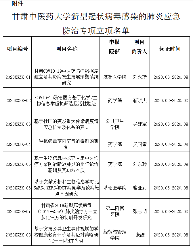 根据《关于印发<威廉希尔支持新型冠状病毒(2019-nc0V)感染的肺炎应急和防治研究工作方案>的通知》(甘中医大科发〔2020〕4 号)精神,公司特设立2020年度威廉希尔新型冠状病毒感染的肺炎应急防治专项项目。经申报人申报,专家组评审,现对“甘肃COVID-19中医药防治数据库建立及其疫病发生发展预警系统研究”等12个专项项目予以立项,本次立项项目经费采用后补助形式予以支持。