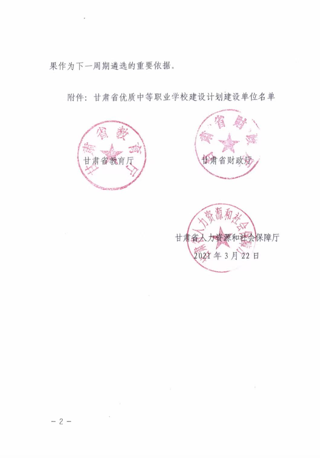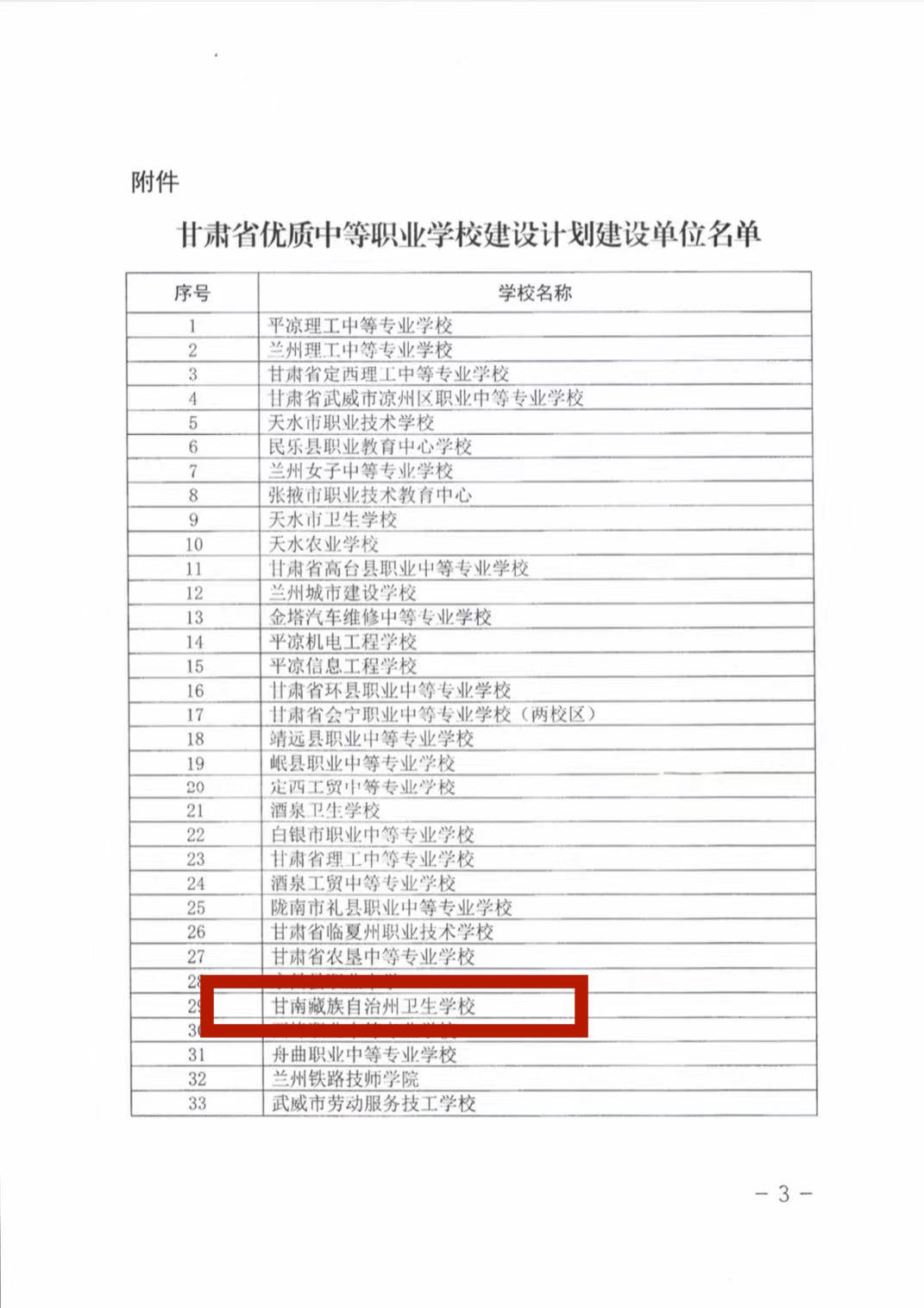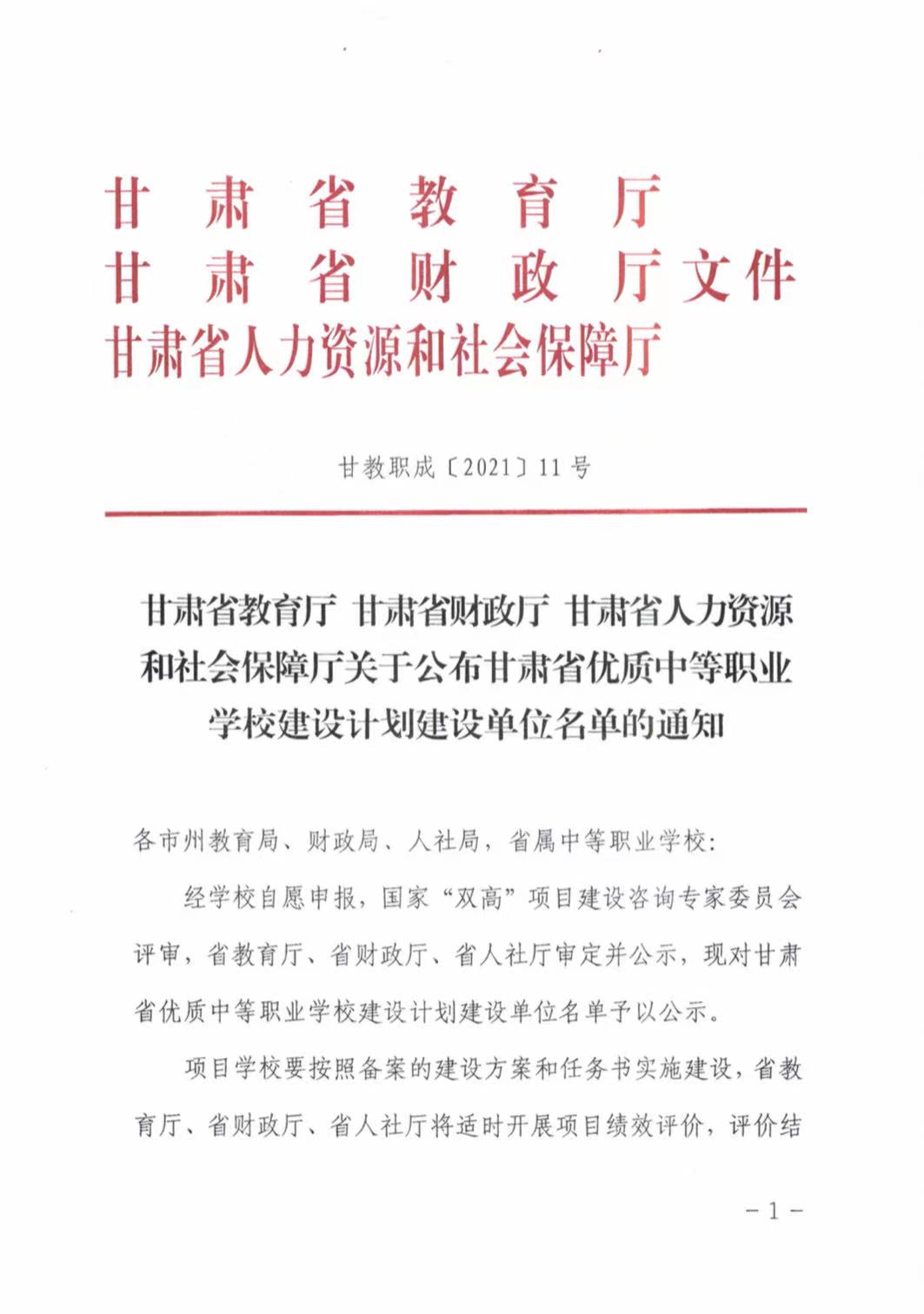 2021年3月22日,甘肃省教育厅、甘肃省财政厅、甘肃省人力资源和社会保障厅印发了《关于公布甘肃省优质中等职业公司建设计划建设单位名单的通知》(甘教职成﹝2021﹞11号),威廉希尔williamhill入选甘肃省优质中等职业公司建设计划。