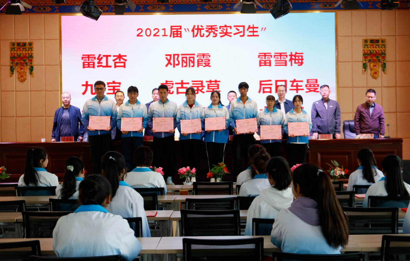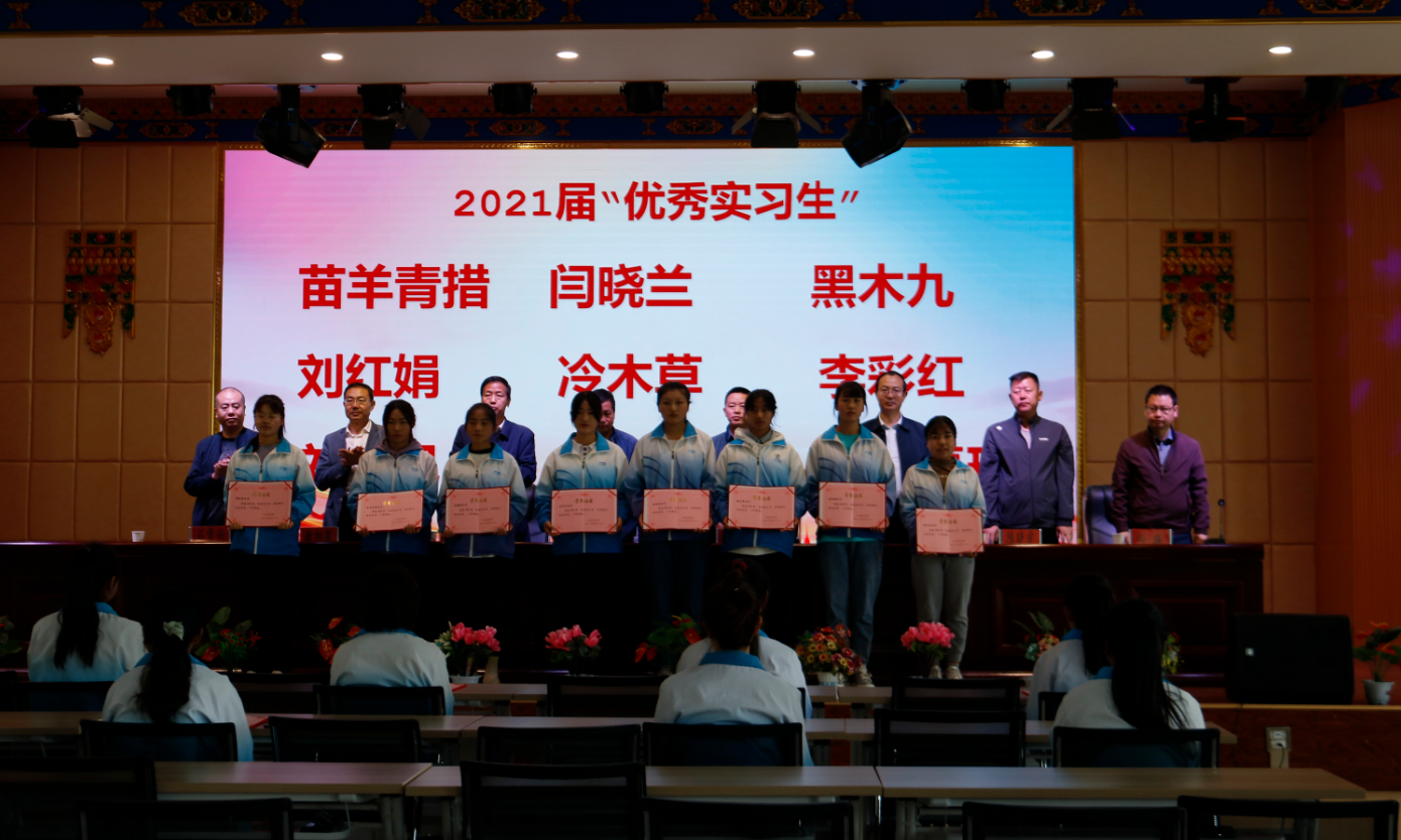 典礼在庄严的国歌声中拉开了序幕,教务科科长杨乐宣读了2021届毕业生名单,员工科副科长马盛宣读了集团对“优秀毕业生”和“优秀实习生”的表彰决定,校领导为获奖的员工们颁奖。
