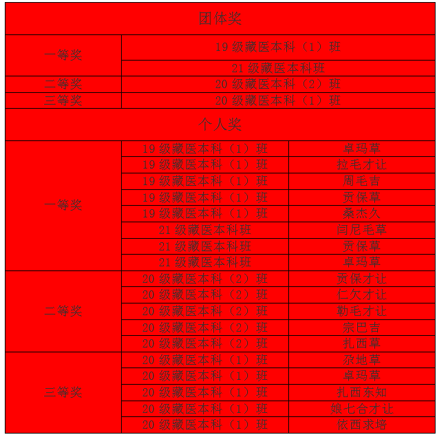 在竞赛现场,各参赛队伍反应迅速、思维敏捷,竞相展现各自的专业水平,选手们充分利用自己的专业知识和技能,相互间密切配合,将竞赛一次又一次推向高潮。经过最终的激烈角逐,19级藏医本科(1)班和21级藏医本科班荣获一等奖,20级藏医本科(2)班荣获二等奖,20级藏医本科(1)班荣获三等奖;卓玛草等8名同学获得个人一等奖,贡保才让等5名同学获得个人二等奖,尕地草等5名同学获得个人三等奖。