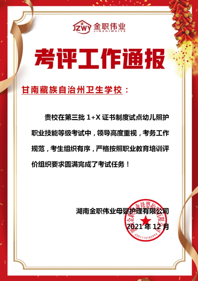 2021年12月4日,1+X幼儿照护职业技能等级证书考试在甘南卫校考点举行了理论和实操考试考评,公司董事长赵苏静、副董事长李小林巡查考试考评工作并提出了指导意见。