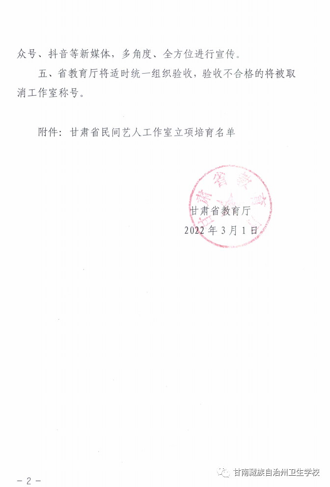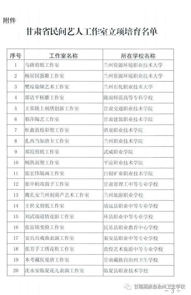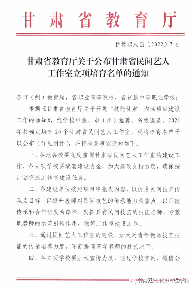甘肃省教育厅下发的《甘肃省教育厅关于公布甘肃省民间艺人工作室立项培育名单的通知》(甘教职成函﹝2022﹞7号)文件,公布了2021年全省确定培育的20个“甘肃省民间艺人工作室”, 这是在全省范围内通过单位申报、市(州)推荐、省级遴选、公示,确定培育的。旨在通过建设规范的、具备较好条件的民间艺人工作室,以促进民间技艺传承为目标,以提升教师对民间技艺的传承能力为重点,以师徒传承和合作研发为路径,发挥具有民间传承技艺的技能名师、专兼职教师的示范引领作用,做好工作室建设工作。